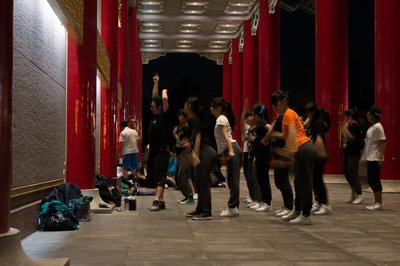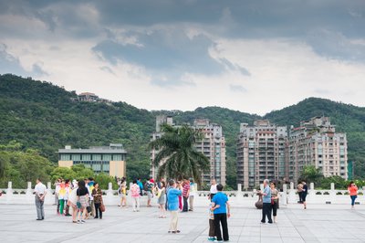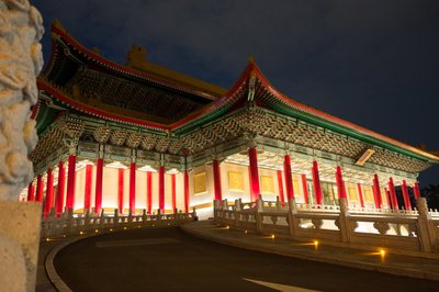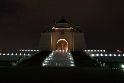 A Taipei Nemzeti Színház statisztál Csang Kai-Sek emlékcsarnoka előtt