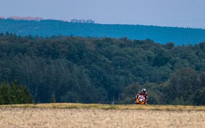 Colin Edwards, a MotoGP edzésén érkezik az erdő sűrűjéből. Távolban a város szélén húzódó házak.