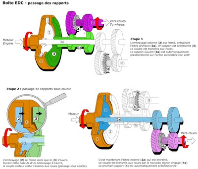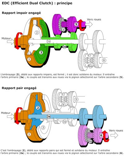 A DSG (EDC) előre bekészíti magának a következő fokozatot. Lényegében két váltóból áll - az egyik üresben jár, és készül a következő műveletre, a másik épp hajt