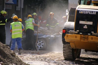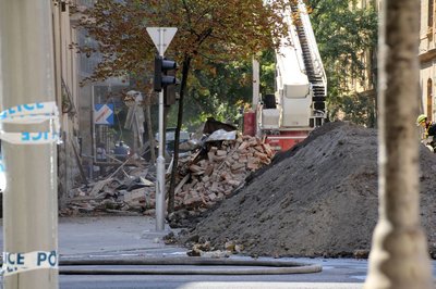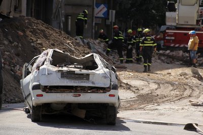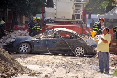 A tűzoltók szabadítják meg a roncsot a ráomlott tégláktól