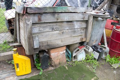 911 a veszélyeshulladék-gyűjtő ládán. A fáradt olajos flakonokra felírja, miből eresztette le, ezért ha jönnek hozzá, hogy traktorba kell, esetleg kerítést akarnak átkenni, tudja, mit ad