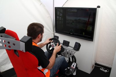 Akadt két jópofa, imbolygó szimulátor is. Addig nem szálltam ki, amíg a kétkörös versenyt meg nem nyertem az utolsó helyről indulva. A SimBin-modelles játékot bárki szabadon letöltheti