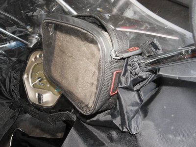 A GPS-tok, aminek rögzítése mellett befolyt a víz a kézvédőbe. Máskor ügyesebben rögzítem, bár ezzel is tököltem vagy egy órát, hogy a motornak se legyen baja, lássak is, és ne is essen le