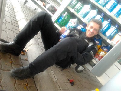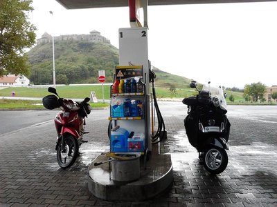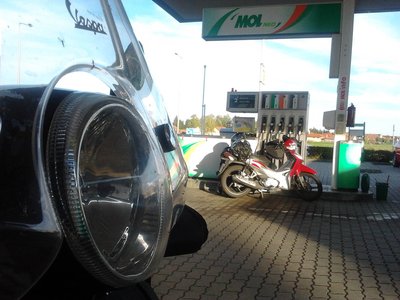 Végre itthon, Lenti mellett az első Mol-kúton. Ezer kanyart megjárt motorjaink álmélkodva nézték a határig vezető nyílegyenes szakaszon fel-alá jaszkarizó CBR-es csávót