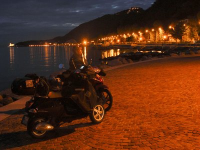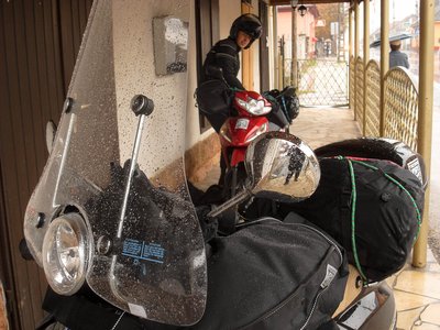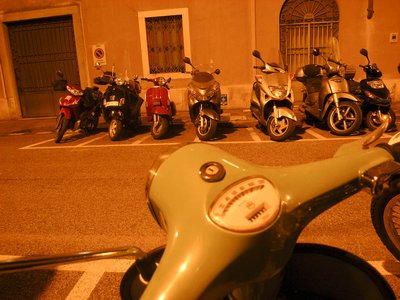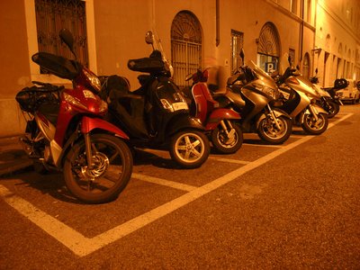 Egy tipikus olasz, városi robogóparkoló apró szeletkéje a mi két gépünkkel a legszélén