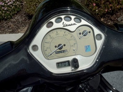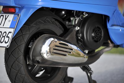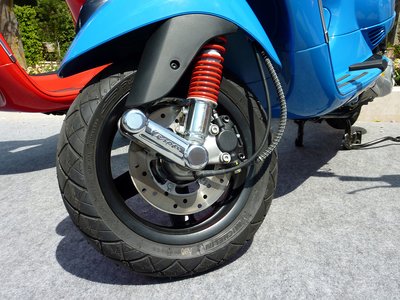 Tízcolos kerék, féloldali lengővillával. Ez eddig régmúlt. Tárcsafék, könnyűfém felnivel. Ez már a 1996-tól számított új korszak jele a small frame Vespákon