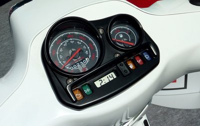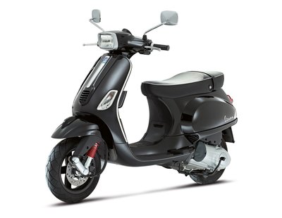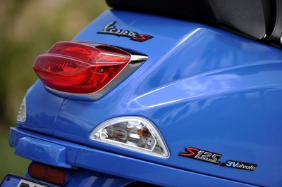 Oldalról a fekete felnik, a piros rugó a nyereg szabása és a hátsó krómkapaszkodó hiánya hívja fel a figyelmet, ez nem egy LX, hanem egy Vespa S