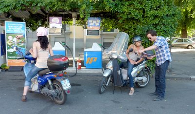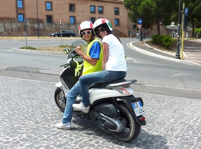 Két stábtag egy Piaggio Libertyn. Andrea, a kísérőnk vezet. A kisujjában van a római közlekedés, és ért a csajokhoz is
