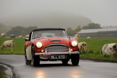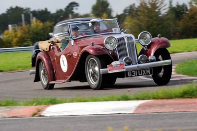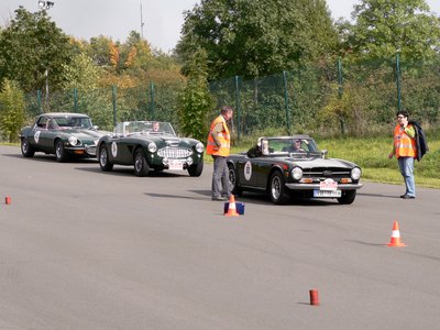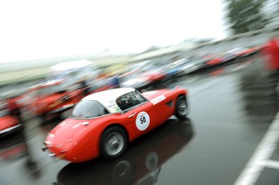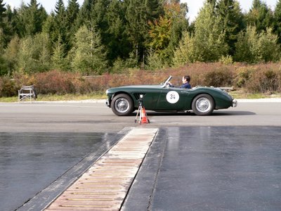 Egy Austin Healey pilótája gyakorolja a fotocellás feladatot.