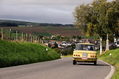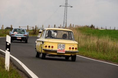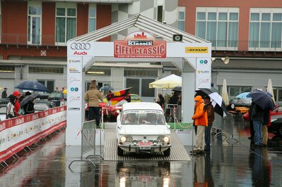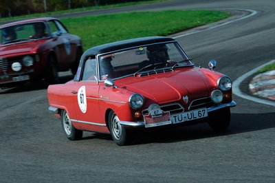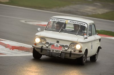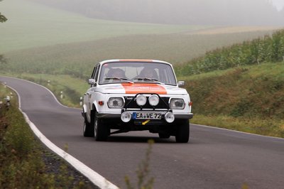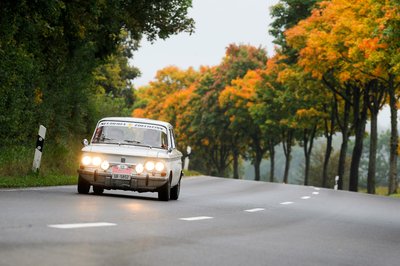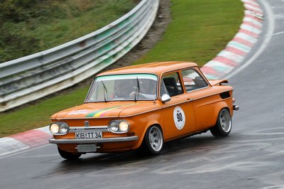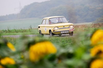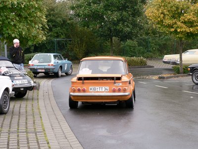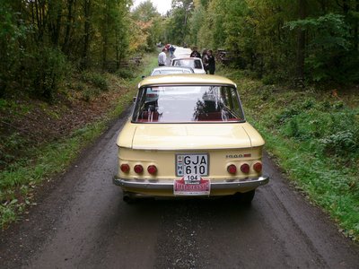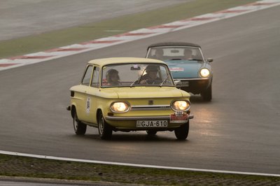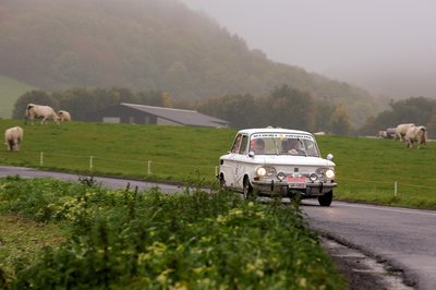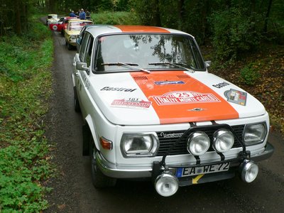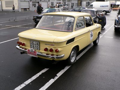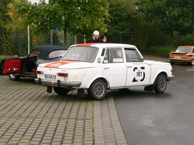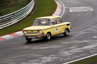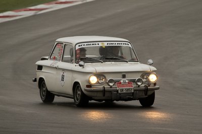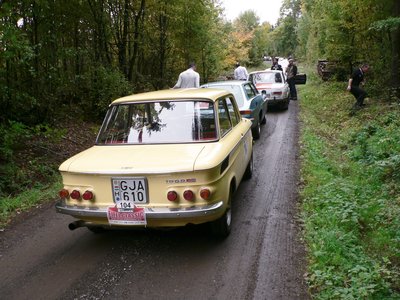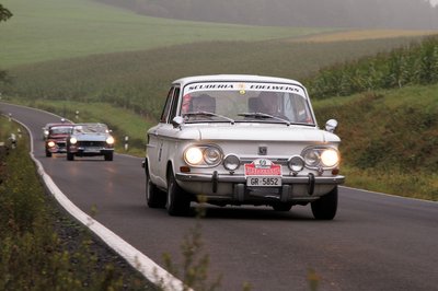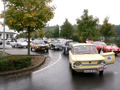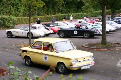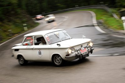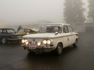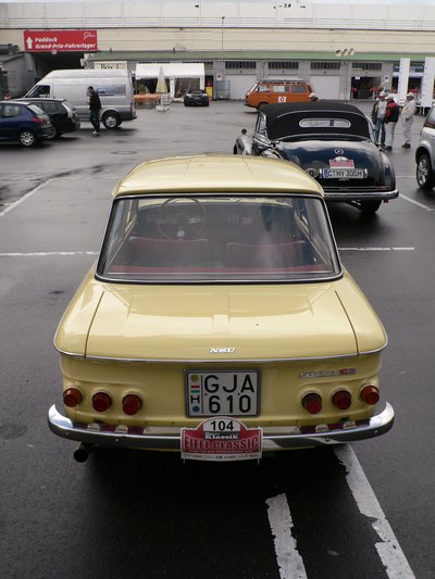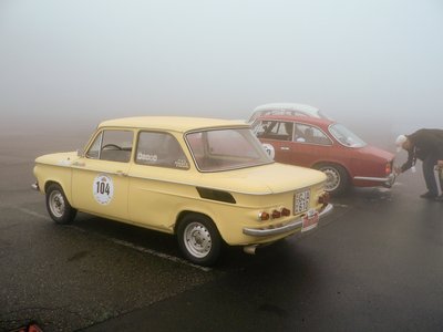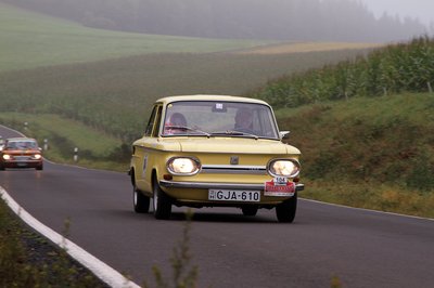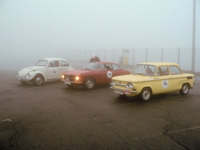 A 15. helyen végzett NSU-s csapat. Hans Dietrich és Andreas barátainkkal állandóan egy bolyban autóztunk. Speciális futóműve, rövidebb váltója és ca. 80 lóereje nagyon élt, amíg nem kezdett morogni a difi. De végig ment.