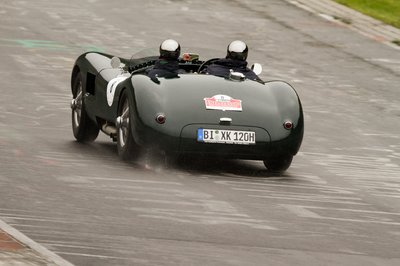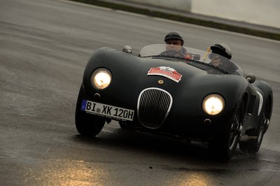 Hőmérséklet 5 C°, tető nincs, fűtés csak a lábnál. Viszont az autó miatt mindez semmiség: Jaguar C-Type (1953). Három példány indult.