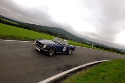 Az a sárga árnyék nem véletlenül követi a TR6-os Triumphot. A brit roadster egy kanyarból rosszul jött ki és a biztonsági korlátra simult fel. Problémamentesen folytatta a karcolások után.