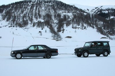 A tapadást vizsgálják így: a terepjáró a nehezék, a vonóerőt pedig a két kocsi közötti rúdon mérik