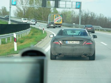 Tisztelt Winkler Róbert! Ma délután az M7-en Bp. felé autózva előztem meg egy BB kezdőbetűs német rendszámú Sprinterből és S-Klassékból álló, felantennázott, Mercedes polós emberekkel teli konvojt, amelynek az első autója egy, a csatolt fotókon látható, álcázott Mercedes kupé volt. Kb. a jelenlegi SL méretével egyező. 1 km-rel később pedig egy kb. SLK méretű szintén agyonálcázott kupét előztem meg. Sajnos egyedül voltam, ezért csak ezt a két képet tudtam menet közben készíteni. Gondoltam, hátha érdekes a kép, ezért küldöm Önöknek. Üdvözlettel, Hajdú Tamás