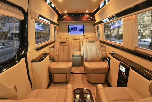 A Brilliant Van névre hallgató Sprinter belsejét teljesen átalakították. Középen négy, egymástól teljesen független szék néz egymás felé – a hátsók mögé betettek egy plusz üléssort, így összesen hét személy szállítására képes a Merci.