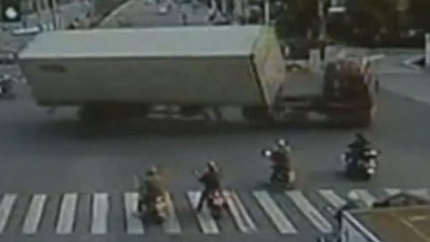 A meglepő eset Kínában történt, de érzésünk szerint akárhol másutt is előfordulhatott volna, ahol a kamionsofőrök jellemzően kevesebb időt kapnak a szállításra, mint amennyibe az út kényelmesen belefér. A késés persze még mindig kevésbé lett volna fájdalmas kivárni még egy lámpaciklust, mint az úttestre borított konténer, a tönkretett rakomány, és persze a környezetben esett kár miatti várható felelősségre vonás. A konkrét esetben csak a puszta véletlenen múlt, hogy mindenki élve megúszta – egy kerékpáros épp a zuhanó konténer útjában volt, és csak annak köszönheti az életét, hogy időben eldobott mindent, és elszaladt a közeledő kamion útjából. Persze a négy motoros helyében sem lettünk volna, akiket végül elkerült – egyedül a belső íven várakozó robogós nézhette végig a műsort viszonylagos biztonságban.
