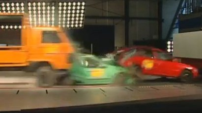 A német autóklub szakemberei egy teherautót húztak bele 70 km/h-s sebességgel két egymás mögött álló személyautóba, egy Renault Mégane és egy Mitsubishi Lancer kombi a két áldozat. 1:30-nál tessék figyelni, hogy mi maradt a két személyautóból: gyakorlatilag olyan a teherautó szempontjából, mintha ott sem lennének.