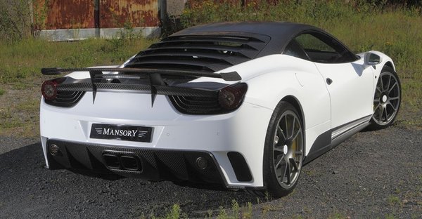 Ennél a Ferrari 458 Italiánál az a húsz lóerő, ami pluszban a motorba került, nem túl nagy változás, a cég ostora az autó külsején csattant. A Mansory mániája a karbonszálas műanyagidomok felhelyezése, amit erőszeretettel használ indokolatlan helyeken is, ennél a Ferrarinál ez különösen feltűnő. Az Italia orrára egy az egyben rá másolták az Enzo orrkúpját a hatalmas légbeömlőkkel, amiket megspékeltek még a parkolóradar érzékelőivel, és a lökhárító aljára helyezett két teszkós LED-sorral. Az első lámpák mellé pedig az autó formavilágához egyáltalán nem passzoló, leginkább a Le Mans-i versenyautókra jellemző karbon mintázatú, bordázott légbeömlőket helyeztek. És ez még csak az autó orra volt. Az autó hátulján egészen ízléses lett az átalakítás, leszámítva a lámpákat körülvevő légbeömlőkbe szerkesztett karbon bordázatot. A 458-as kupé változatához szánt csomaghoz tartozik még a karbon hátsó szárny, illetve a motor fölötti ablakra biggyesztett gengszterrács.