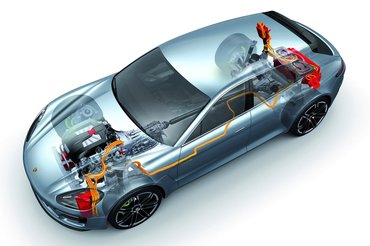 A Porsche jövőképét jelzi az adatlap is: a formás test alá hasonló hibridhajtást építettek, mint ami a jelenlegi Panamerában és Cayenne S Hybridben dolgozik. A háromliteres, 333 lóerős V6-os mögé egy kilencven lóerős villanymotort pakoltak, amely az aktuális szériamodellekéhez képest megduplázott elektromos teljesítményt jelent. Ezzel tisztán elektromos üzemben 130-ig gyorsulhat a hibrid Porsche, és elméletben harminc kilométert tud megtenni benzin nélkül. Az ehhez szükséges akkumulátort a csomagtartó alatt rejtették el - ezt két és fél óra alatt lehet feltölteni konnektorról.