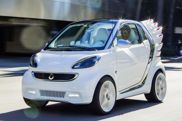 Jeremy Scott volt az, akire rábízták a kisautó átöltöztetését. Alighanem abból indult ki, hogy az alap a tiszta, elektromos üzemű változat, ezért dundi kis hattyút formált a Smartból. A Tridion-keret és a lámpakeretek krómszínűek, az autó kívül-belül hófehér, hátul pedig piros-fehér szárnyacskák díszítik a járművek. A króm-fehér színvilágot csak a tollak közének vörös színezése töri meg. Igaz, ami igaz, a látvány elég meglepő, legalábbis elsőre, így a célt elérik vele: a Los Angeles Auto Show-n biztos sokan jól megnézik majd a kerekekre állított Asterix-sisakot.