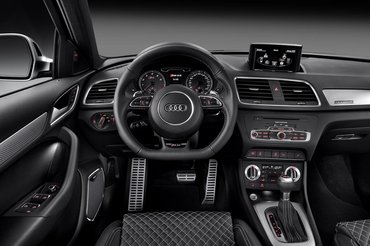 A nagy kerekekkel és az ületetett futóművel az RS Q3 már-már személyautósan alacsony lett, és erre még rájátszanak az ebben a műfajban ma már szinte kötelező nagy légbeömlős első, és diffúzoros hátsó lökhárítók. Belül természetesen a szokásosnál határozottabb oldaltartású üléseket és rengeteg alumínium hatású díszítőelemet találunk. A kormány alja is lapított, ahogy a sportos autókban szokás, a váltókar pedig gusztusos félig fém, félig bőr gombot kapott, annak ellenére, hogy nemigen fogják markolászni a felhasználók, hisz a váltó vagy automataként működik, vagy a kormány mögötti fülekkel kapcsolható a legegyszerűbben.