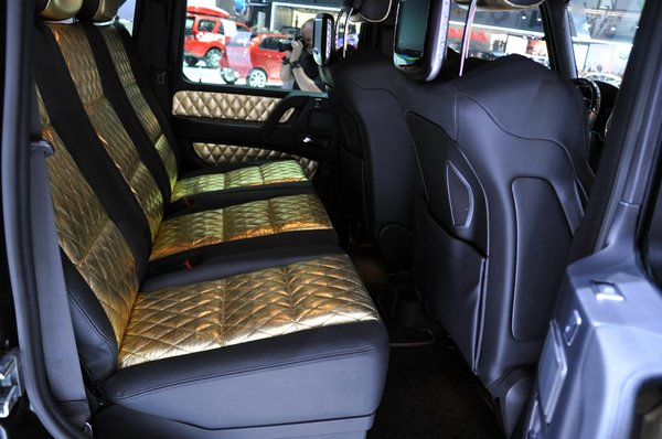 Az új, sportos kinézet a teljesen egyedi gyártású és átalakított elemeknek köszönhető. Kedves olvasó, ha ön – a képeket nézve – úgy gondolja, hogy egy G-Mercedes kinézete sportos, akkor sürgősen keresse fel szemorvosát. Hogy mégis, miért kéne ezt gondolnia? Elsősorban ott vannak a tükrök. Szénszálas műanyagok, aranyszínben, iszonyatosan oda nem illő integrált indexekkel.