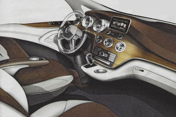 Előkerült egy rajz a belső térről is, amely a jelenlegi divatot követve már-már szenmélyautósan kidolgozott és díszes. Csupán a magasra helyezett váltókar és könyöklő jelzi, hogy jóval magasabb, tágasabb modell belsejét látjuk. Természetesen itt is egy jó nagy képernyő szolgál az információk többségének kijelzésére, és a luxusmodellekben ma már szinte kötelező tekerőgomb is felbukkan, ezúttal a vezetőülés belső karfáján.