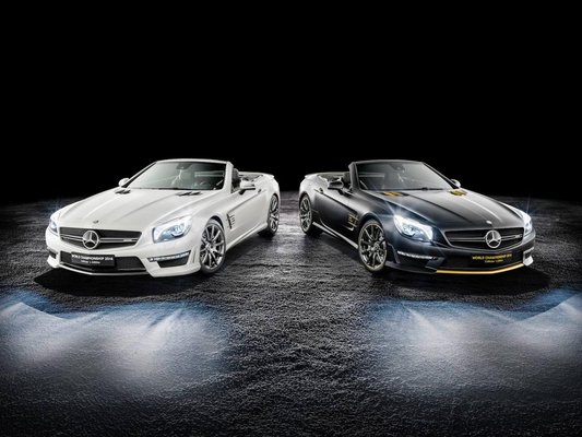Ebből az alkalomból az SL63 AMG-t vették elő, és készítettek belőle kétféle limitált szériás kiadást. A fekete-arany és fehér ezüst példányok tervezésében a két Forma-1-es pilóta is részt vett. A különleges fényezésen kívül nincs nagy különbség a sima SL63 AMG-khez képest: mindössze egy plakettet kapnak az autók. A Lewis Hamilton nevével fémjelzett változatnál ez a táblácska a silverstone-i, a Nico Rosberg-féle modell pedig a hockenheimi versenypálya körvonalát tartalmazza.