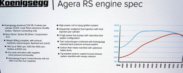 Annak idején a Ford moduláris, ötliteres V8-asával kezdte a Koenigsegg a teljesítményhajszolást, de azóta az eredeti motorból vajmi kevés maradt. A két turbó változó geometriájú, mint a Porsche 911 Turbónál, a szívó- és kipufogóoldal (a szívó természetesen szénszálas műanyagból), a vezérműtengelyek-dugattyúk és a főtengely, a csapágyak, a gyújtáselektronika, a pillangószelepek, a hengerenkénti dupla befecskendezők, a titán hajtórudak, a száraz karteres kenés és a négy nagynyomású üzemanyagszivattyú, egyszóval a pőre blokkon kívül mind-mind saját fejlesztés.