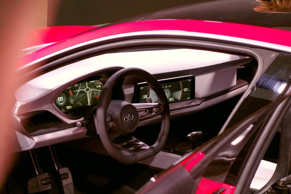 Bent – mint szinte minden prototípusban – két kézzel pazarolták a teret. A kilincs a karosszériába simul, hozzáérésre kissé kitüremkedik, markolod, feltárod az ajtót és igazi tanulmány-belső térbe toppansz. Csak négy ülés van, filigránok, szénszálas héjúak, spéci szövésűek a szövött részen, spéci bőrösek a bőrös részen és már szemre is borzasztó kényelmetlenek. Ahol nincs szövet és bőr és alumínium, ott a szénszál az úr – ilyet is tudunk geccó. A Nagy Gombtalanítási trend utolérte a Kiát is: itt szintén az LCD-kijelzőkön van a hangsúly, ilyenből pedig nemcsak középen, hanem a vezető előtt is van egy óriási. Alul lapos kormány, kormány melletti flepnis a váltó, a belső tükör helyett pedig kamerás-LCD-s hátranéző rendszer – menet közben is. Húdemodernittminden.