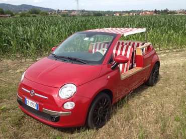 A beachcar vagy strandautó a huszadik század szebb éveinek szülötte. A műfaj az ötvenes-hatavanas években volt különösen kedvelt, Európában legjobban talán a Fiat maxolta ki a témát. A képen látott autó ihletője az eredeti Fiat Cinquecento Jolly, amit a Ghia készített 1957 és 1974 között. Ezek lényegében kabrió 500-asok voltak első ajtók nélkül, újraértelmezett vászontetővel, faberakásokkal. Ez a Fiat nem titkoltan a Ghia strandautóihoz nyúlik vissza, a készítő neve sem véletlen Jollycar. Alapja egy aktuális Fiat 500, az a piros-fehér asztalterítő rajta pedig maga a vászontető. Azt mondják, a megrendelők széles skálán szabhatják ízlésükre az autüt, így a fonott ülések helyére egész biztosan kérhető fröccsöntött műanyag is.