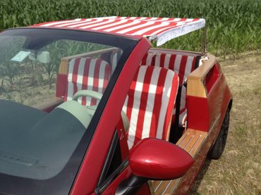 Nem egy jól sikerült dizájntermék, csak jó időben használható, de legalább drága, és jól mutat a strandon. Feltámasztják a Ghia strandautóját.