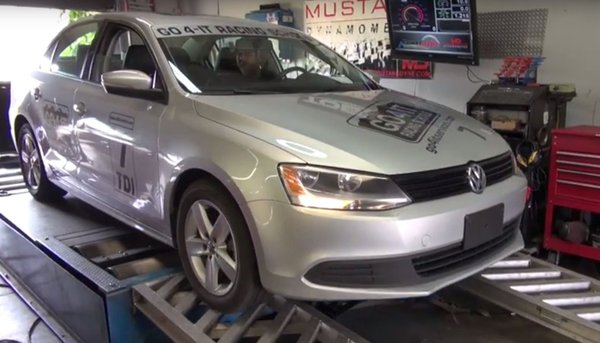 Az első mérésen a 2011-es Jetta TDI tesztautó hátsó kerekeit is forgatta a fékpad – ezzel tudták elérni, hogy úgy működjön, mintha közúton használják. Itt az autó, amely papíron 140 lóerőt ad le 4000-es fordulaton, a csúcsnyomatéka pedig 320 Nm, 138,5 lóerőt és 352 Nm-t adott le, azaz a maximális nyomatéka jelentősen több volt, mint a gyári érték. A második mérésen, ahol nem forgatták a hátsó kerekeket, az autó a tesztelők szerint érezhetően átváltott egy másik üzemmódba. Itt a csúcsteljesítmény alig csökkent – 136,5 lóerőt mértek – viszont a maximális nyomaték lement 309 Nm-re.