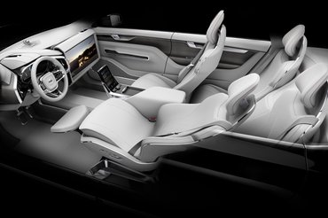 A tervezők nyilván igyekeztek a figyelmet a vezetőülés új funkcióira terelni – talán ezért is lett a kísérleti belső tér végletesen, már-már az unalomig egyszerű – bár ez egyébként is nagyszerűen illik a Volvo aktuális stílusvilágához. A fehér bőr- és műanyagfelületek steril hangulatát csak néhol törték meg furnér-mintázatú burkolati elemekkel és némi krómmal vagy lakk-feketével, így az egyszerűség még sem jelent teljes sivárságot. Az ülések formázása viszont egyszerre sugall kényelmet és célszerűséget.