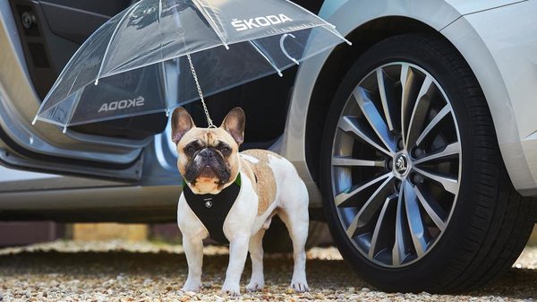 A cseh márka másik nagy április elsejei ötlete a Superb beépített esernyőinek méltó kiegészítője, a kutyaernyő, amely szintén a csúcsmodell drágább változataihoz járna. Állítólag az esős brit időjárásban tesztelték, ami jó ajánlólevél is lehetne, azt viszont nem említik a gyáriak, hogy a kutyák mit szóltak a pórázukhoz erősített átlátszó műanyagernyőhöz.