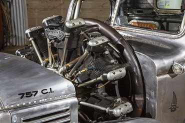 A durván 300 lóerős motort a motorház hátsó részébe sikerült befaragni, bár nem passzol tökéletesen: a hengerfejek belógnak a szélvédő elé. A hajtást sem volt egyszerű levenni a főtengelyről, végül ezt a feladatot egy tenyérnyi széles, eredetileg kompresszorokhoz való fogasszíjjal oldották meg, amely egy motorcsónak-szöghajtás tengelyéhez csatlakozik, az pedig egy automata váltót hajt meg. Ám a lényeg nem is a műszaki megvalósítás, hanem a tökéletes dieselpunk stílus. A csiszolt acél karosszéria, a szegecselés az ablakok peremén, a tetőablakok, a zsúfolt műszerfal és a két, lánccal összekötött félkormány – igen, bal- és jobboldalt is van egy-egy – mind a régi légcsavaros repülőgépek világát idézi.