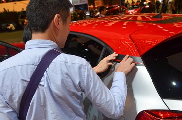 Minden műanyag tele van ívekkel. Nem csak a mintázott ajtóbelsőn, de még az olyan részletekben sem megúszásra játszottak, amelyeknél senki nem tenne szóvá, ha nincs benne sok fantázia. Ezzel szemben a körítés borzalmas. Azért is életstílus-autó az új C3, mert már a rajtnál többféle feltűnő változattal szórták meg a kínálatot. Van vászontetős, színes tetős, mindenféle kettős tónusú, matricás változat. Az egyik ilyen kiállított autó csúnyán levágott matricája volt az, ami még az arra járó kínai kémeket is megmosolyogtatta, pedig ők azért láthattak már csúnyábbat is. A kiállított autók mindenfele (csak középen nem) álló kormányaiból pedig csak itt csináltak sportot.