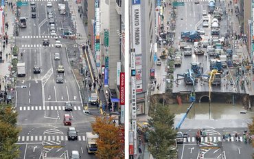 Az elmúlt hét vírusképe lett a képpár, amin a japán Fukuoka hónap elején beszakadt csomópontja látható. Az öt sáv széles, több méter mélyen beszakadt út villámgyors javítása a japán munkaszervezés friss szimbóluma a neten, pedig a javításról csak előtte-utána-fotók keringtek. Mostanáig. Videón a 0-24-es munka: