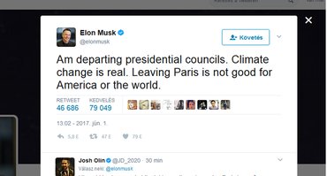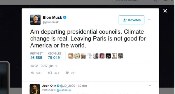 Ahogy ígérte, meglépte: Elon Musk otthagyja Donald Trump amerikai elnök tanácsadói testületét. A Tesla – és még több más techcég – vezére ezt rögtön azután posztolta Twitterére, hogy Trump bejelentette: az USA kilép a párizsi klímaegyezményből.