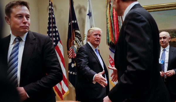 Trump és Musk között sosem volt nagy az egyetértés, de Musk elfogadta az elnök felkérését, és ezidáig aktívan részt vett annak tanácsadói testületében. Sokan nem értették miért dolgozik a klímaváltozást többször hoaxnak nevező Trumpnak a klímaváltozás elleni küzdelem legnagyobb celebje, de Musk eddig azzal hárított: így legalább lát rá esélyt, hogy jó irányba terelheti az elnök politikáját. Ez a munkakapcsolat máig tartott, Musk tömör Twitter-üzenetben köszönt el a tanácsadói tisztségtől.