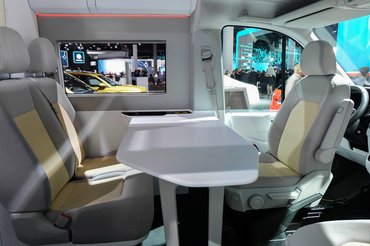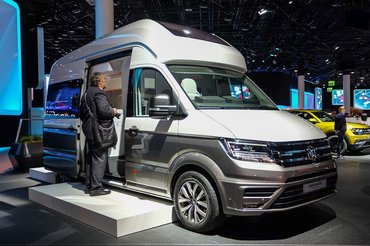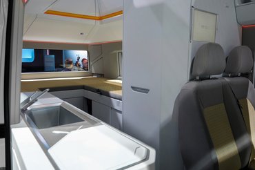 Ha már nagy test, akkor sokkal jobban tetszik a California XXL, ez a Crafter-alapú, hatalmas ingatlan. Belül tiszta szupermodern szállodai szoba négy főnek, kihúzható zuhannyal, kétméteres ágyakkal, beépített kávéfőzővel, elektrokróm, állítható fényáteresztő-képességű tető-üvegpanelekkel. Iszonyatosan állat, azonnal indulnék vele Európa-túrára, de sajnos nem lehet, mert csak tanulmány.