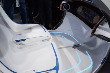 A forma nem túl izgalmas, valószínűleg így a legjobb a helykihasználás és a légellenállási együttható, ellenben az apró formai gegek elég ütősek. A lézerszálas fényszóró fénykibocsájtó csíkjai például spirálban futnak, ami a villanymotor tekercseire utal. Aztán ott a hűtőrács, amire igazából már nincs szükség, ezért egy LCD panel került a helyére. Ezt lehet értelmes dolgokra használni, például így már nem csak fényjelekkel tud kifele kommunikálni a sofőr, de egy gif-fel is elküldhetjük az elénk vágó parasztot a francba.