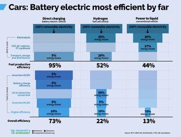 Az ábra szerint a villanyautó a teljes energia 73%-át hasznosítja, a hidrogén-hajtásnál 22%-ot hoztak ki, a belsőégésű motorral hajtott autó esetében pedig 13% a végeredmény. A hagyományos autóknál úgy számoltak, mintha tiszta villanyáramból állítanánk elő az elégetésre szánt üzemanyagot, ami egyszerűen nem így zajlik. Ezzel eleve 44% veszteség keletkezne, ami nyilván nem keletkezik a valóságban. Közben az elektromos autók hajtásához használt villanyáramot 100%-ban megújuló forrásból származtatták, ami szintén távol áll az igazságtól, hisz az áram előállításának ma még csak egy része származik megújuló forrásból, egy másik, szép nagy hányad fosszilis energiahordozók elégetésével áll elő, vagy atomerőművekből érkezik.