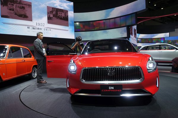 A Daihatsu pár éve kivonult Európából, nálunk pedig már vagy ezer éve nem forgalmazzák autóit, pedig a Toyotához köthető, amúgy 1907-ig visszanyúló történelmű márka nagyon érdekes dolgokat művel. A Tokio Motor Show-n jó sokféle 660 köbcentis, adó-optimalizált kei autót állítottak ki, például a kívül szűkös, belül tágas Move Canbus kisbuszt, de csak egyetlen autó tudta megkaparintani a lelkemet. Egy kis metálsárga, miniszedánról (vagy négyajtós kupéról) van szó, egy csábos vakarcsról az emelvényen. A Compagno DN a hatvanas években gyártott elődje előtt tiszteleg, persze mai méretben és technikával. Kicsi autóról van szó, mert bár nagyautósak az arányai, csak négyszemélyes, ami gyakorlatilag kettő, mert hátul elég nyomorúságos lehet utazni.