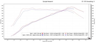Ezeket az értékeket persze Sport Plus módban tudta a gép, Eco üzemmódban 610 lóerőre csökkent a csúcsteljesítménye, hátsókerék-hajtású módba kapcsolva pedig 593 lóerő és 783 Nm csúcsérték adódott.