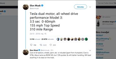 Kiderült az ára is: a korábban híresztelt 70 ezer dollárnál kicsit húzósabb, 78 ezer lett végül (20 millió forint), de Musk megnyugtatta a Twitter népét, hogy ez nagyjából egy BMW M3 ára. És ha már felállt a párhuzam, egyúttal leírta azt is, hogy az M3-nál amúgy tizenöt százalékkal gyorsabb a kétmotoros Model 3 és még vezetni is jobb. Kategóriájában mindenkit elver majd pályán – zárta a csiripet. Hogy hány körig tart a mindentverőség, arról nem esett szó...