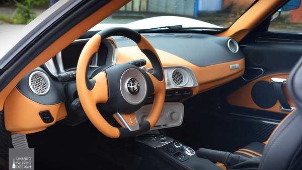 Oldalt történt talán a legkisebb változtatás. Profilból nézve egy óriási, szürke Alfa logó viszi el a show-t. Belül már kicsit elragadtatták magukat a tervezők, a narancssárgás bőr lehet, hogy egy kicsit sok, egyébként nagy vonalakban maradtak a gyári 4C belsőnél.