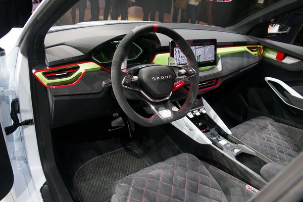 A belső tér is messze áll bármilyen aktuális Škodától, arról nem is beszélve, hogy négy egyedi sportülést pakoltak a belsejébe. A szinte mindenhol karbonnal és alcantarával borított belső térből azért azt is le lehet szűrni, hogy a belső formák újabb generációja merre indul el. Ez egy fokkal modernebb, mint a Kodiaq és a Karoq belseje: a szerelvényfal lépcsőzetes egy kicsit, a légbefúvókat meg szintén háromszögesítették. A központi kijelző egy odatűzött tablet, viszont a középső légbefúvó beépítését nem akarták összeegyeztetni vele, ez elég mélyre került. Fura, mert az új kori Škoda eddig soha nem rendelte alá a formának a funkciót, még a Felicia Fun esetében sem. Aztán persze meglátjuk, mi lesz a realitás a Rapidnál.