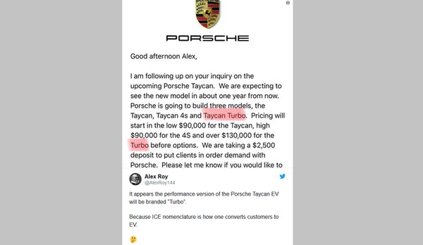 Szóval hiába a villanyhajtás, a Porsche a Taycannál is megtartja a bevett elnevezést a szintlépcsőknél. Így kerülhet a piacra a márka első villanyautójának csúcsváltozata Turbo néven, míg a középszint itt is az S-jelzést kapja majd. Az árak meg ugye a tweet szerint 24 millió forint körül indulnak, de a csúcs Turbo már 35 millió fölé nyúlik. Azaz lényegesen olcsóbb lesz, mint a Tesla szintén hamarosan érkező csúcsvillanyautója, a Roadster, ami 200 ezer dollárról (54 millió forint) indul majd.