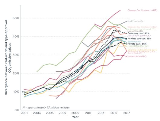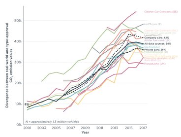 Az ICCT legkorábbi adatai 2001-ből valók, és akkor az eltérés még 8% volt, de ez az érték 2015-ig folyamatosan növekedett 40%-ig, és csak az utóbbi években látható minimális, 1% körüli visszaesés. Ez a gyakorlatban azt jelenti, hogy a fogyasztási, és ezzel arányban a szén-dioxid-kibocsátási átlag elvi csökkenésének nagyjából a kétharmada a valóságban nem zajlott le. A gyári mérések alapján a 2001-es 170 g/km-ről 2017-re 119 g/km-re csökkent a szén-dioxid-emisszió, és ennek megfelelően a fogyasztás. Ehhez képest a valóság az ICCT állítását figyelembe véve még mindig valahol 150 g/km felett lehet.